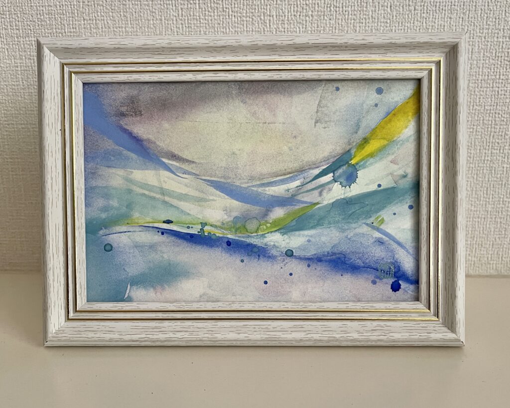 ハガキ大の作品を安価な額に入れてお届けしますので、お好きな額に入れ替えていただくのも宜しいかと思います。